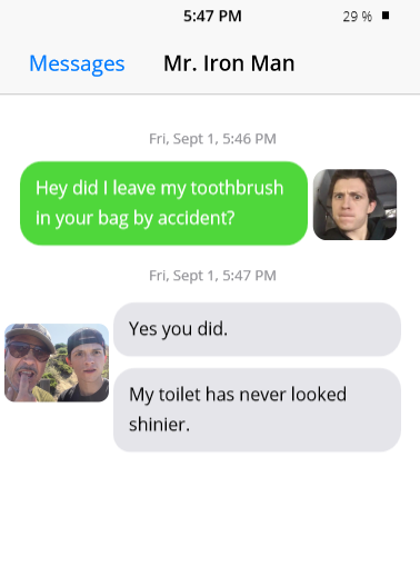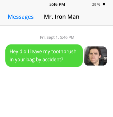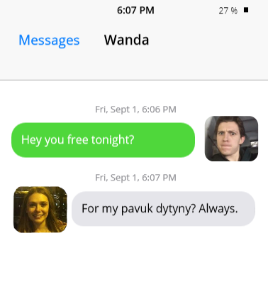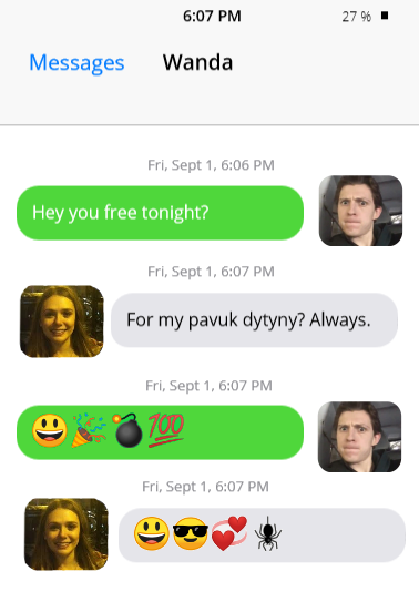 “I will!” Peter shouted back, belly-flopping onto the bottom bunk of his bed with his phone so close to his face, he could see his breath marks on the screen. It was an easy way to ignore the open handy-me-down suitcase from Uncle Ben that laid on his floor — t-shirts, pants, and boxers spilling out that still needed put away.