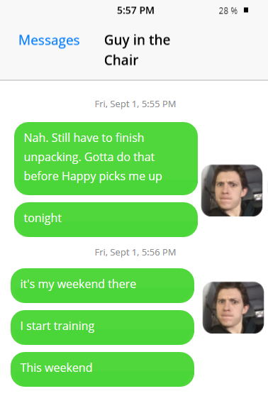 Without even thinking about it, Peter scrolled through his phone and opened his text messages. He’d get around to unpacking at some point. It’d probably be around the time he didn’t have any clean clothes left but hey, it’d get done.